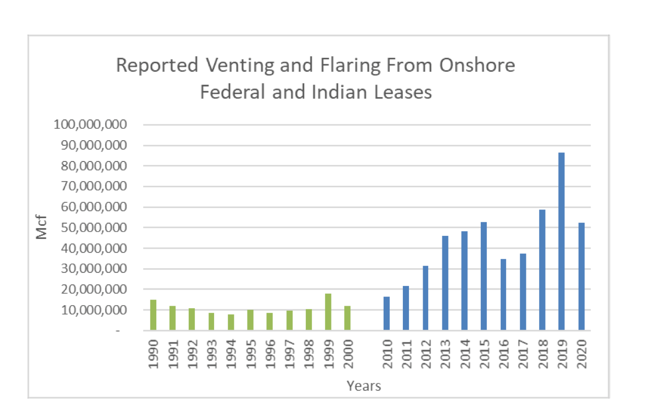 Despite the increasing presence of electric vehicles in the United States, venting and flaring activity from oil and gas production on public lands has grown significantly in the past few decades. The Department of Interior projects that between 2010 and 2020, total volumes of natural gas lost to venting and flaring on federal and tribal lands averaged about 44.2 billion cubic feet per year. This number dwarfs the 11 billion cubic feet estimated as lost due to the same activities in the 1990s.