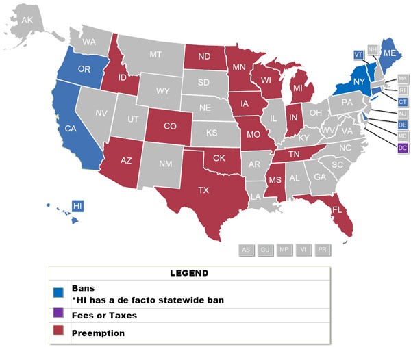 However, not all states have taken the same aggressive efforts to mitigate the impact of plastic bags on the environment. As depicted above, several states have preempted such regulations, which prohibit municipalities from adopting local ordinances that further regulate the use of plastic bags. Notably, companies involved in the plastics industry have sought such preemption to protect their interests and to block progress at regulating plastic pollution at the local level. State legislators in various states, including Florida, Wisconsin, Indiana, Iowa, Michigan, Mississippi, Missouri, and Arizona have already preempted plastic regulation on plastic bags.